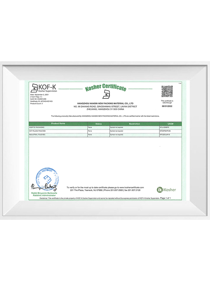 Certificati HOME / Certificati L'UNICO MEMBRO EU ABMA IN ASIA Premiato con le certificazioni industriali e di qualità più complete in Cina. 7 Categoria1 BRCS ISO45001 FSSC22000 ISO22000 ISO9001 Certificato Halal Certificato Kosher BRCS ISO45001 FSSC22000 ISO22000 ISO9001 Certificato Halal Certificato Kosher